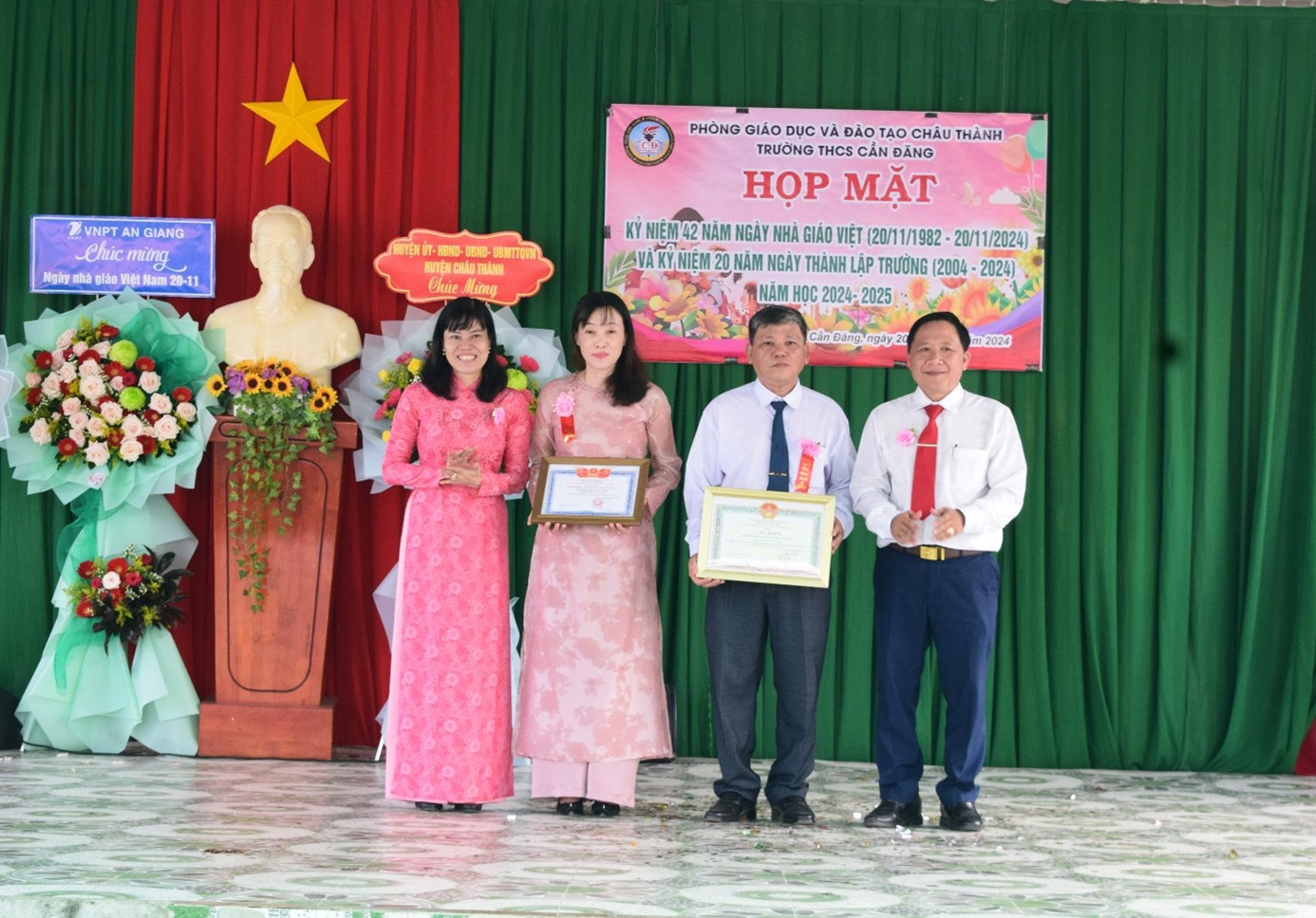 Lãnh đạo UBND huyện và lãnh đạo Phòng Giáo dục và Đào tạo huyện Châu Thành trao Bằng khen của UBND tỉnh cho “Tập thể Lao động xuất sắc” Trường THCS Cần Đăng trong thực hiện nhiệm vụ năm học 2023-2024.