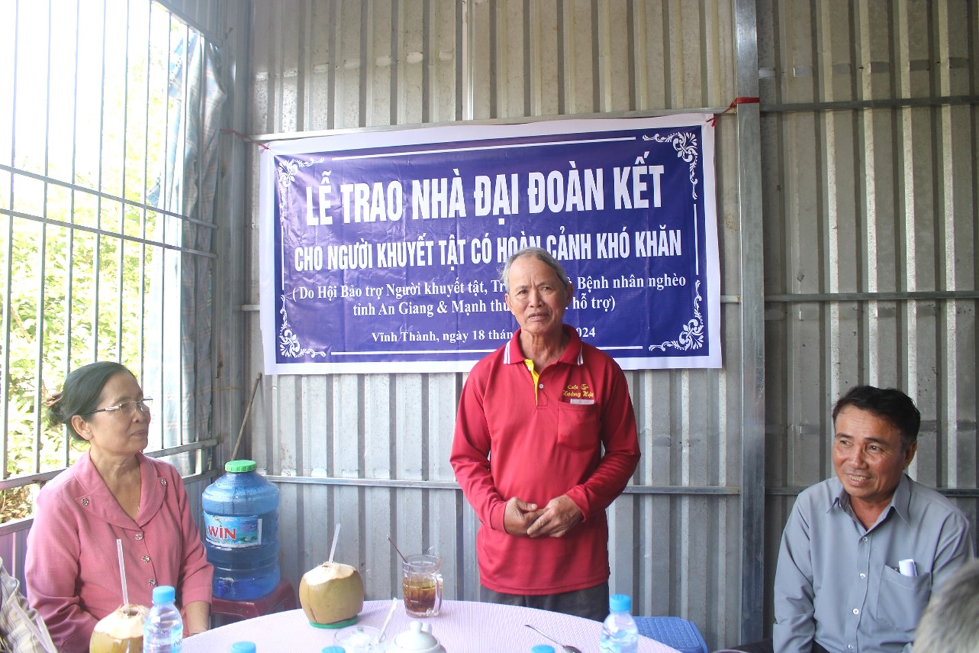 Theo đó, ngôi nhà Đại đoàn kết có diện tích 40m2 được trao cho hộ ông Nguyễn Văn Ty, ngụ tổ 21, ấp Đông Phú 1, xã Vĩnh Thành. Với thiết kế khung kẽm, nền gỗ, mái tole, vách tole. Tổng kinh phí xây dựng trên 50 triệu đồng, trong đó Hội Bảo trợ, Trẻ mồ côi và bệnh nhân nghèo tỉnh An Giang hỗ trợ 10 triệu đồng, vận động xã hội hóa 19.700.000 đồng và 30 ngày công lao động phần còn lại do gia đình đóng góp.