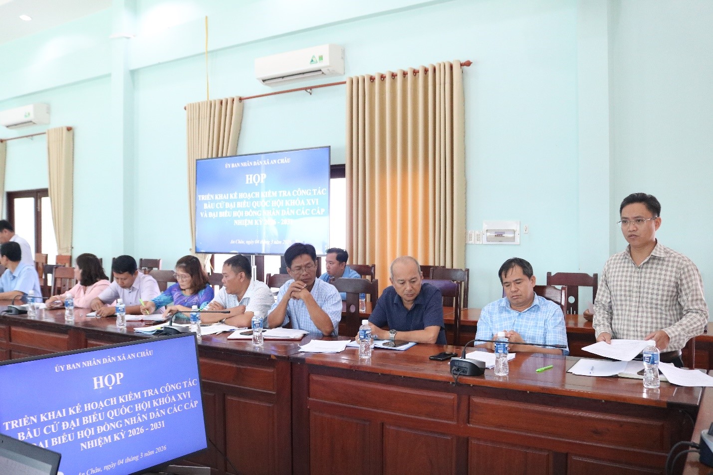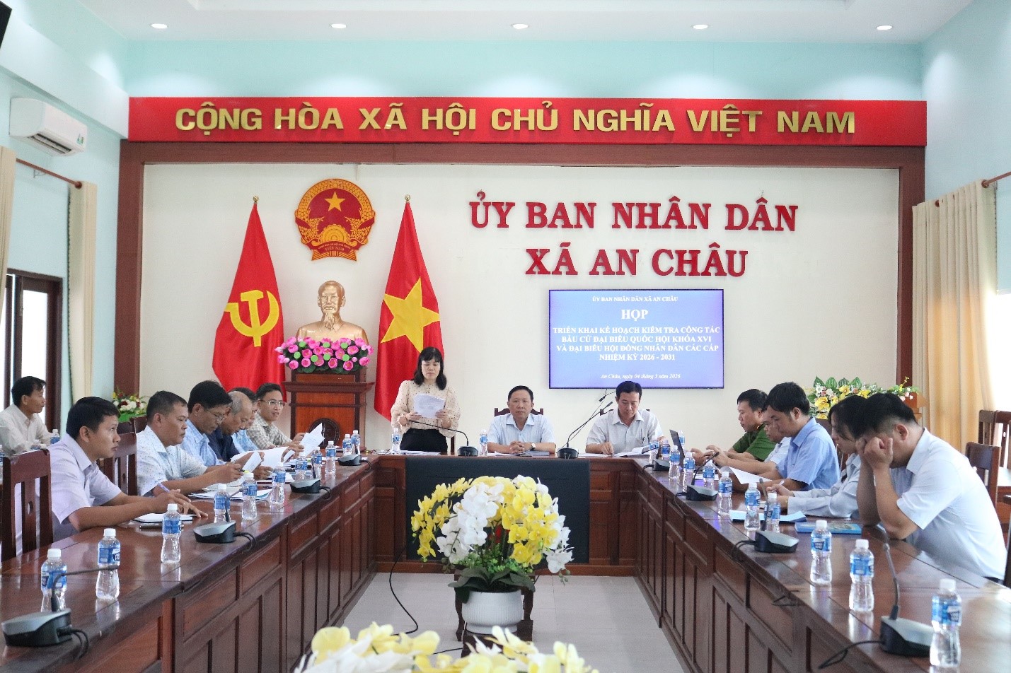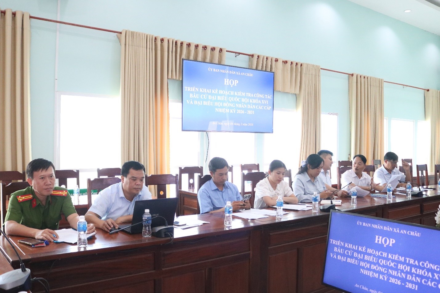 Ngày 04-03-2026, Ủy ban bầu cử xã An Châu tổ chức hội nghị triển khai kế hoạch kiểm tra công tác bầu cử đại biểu Quốc hội khóa XVI và hội đồng nhân dân các cấp nhiệm kỳ 2026-2031. Ông Lê Hồ Ngọc Trung – Phó Bí thư Thường trực Đảng ủy xã; ông Trương Thành Trung – Phó Chủ tịch HĐND xã; ông Hồ Hữu Tài – Phó Bí thư Đảng ủy, Chủ tịch UBND, Chủ tịch UBBC xã chủ trì hội nghị; tham dự còn có bà Huỳnh Thị Thanh Tuyền – UVBTV Đảng ủy, Phó Chủ tịch UBND xã; thành viên UBBC xã.